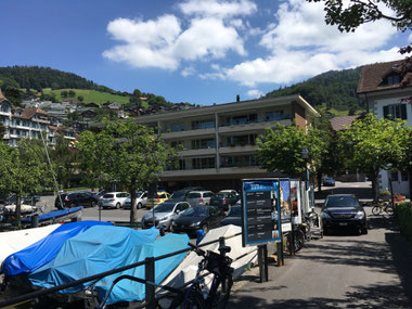 Wo früher die Leute in Oberhofen ihre Schiffsbillette kauften, ist heute das Pier 17, ein gemütliches Beizli einquartiert. Für uns ein Grund, dort ab und zu Sommerstimmung zu geniessen. So auch am vergangenen Sonntag. Immer ist etwas los, immer gibt es etwas zu sehen. Die an- und abgehenden Kursschiffe sorgen für Abwechslung. Möwengeschrei lassen mich den Himmel absuchen. Zwei kläglich jammernde adulte Mittelmeermöwen, die über dem Dach eines Mehrfamilienhauses ihre Runden flogen, weckten meine Aufmerksamkeit. Was war los? Ich hatte kein Fernglas mit dabei, meinte aber, hinter dem Dachrand sei kurz etwas Flaumiges aufgetaucht. Und tatsächlich; auf dem Eternitdach liess sich später ein Jungvogel erkennen. Da hat ein Paar Mittelmeermöwen offensichtlich einen Brutversuch unternommen und das aktuelle Resultat war ein ca. 1-2 wöchiges Küken. Die Aufnahmen von heute haben die sonntägliche Beobachtung bestätigt.